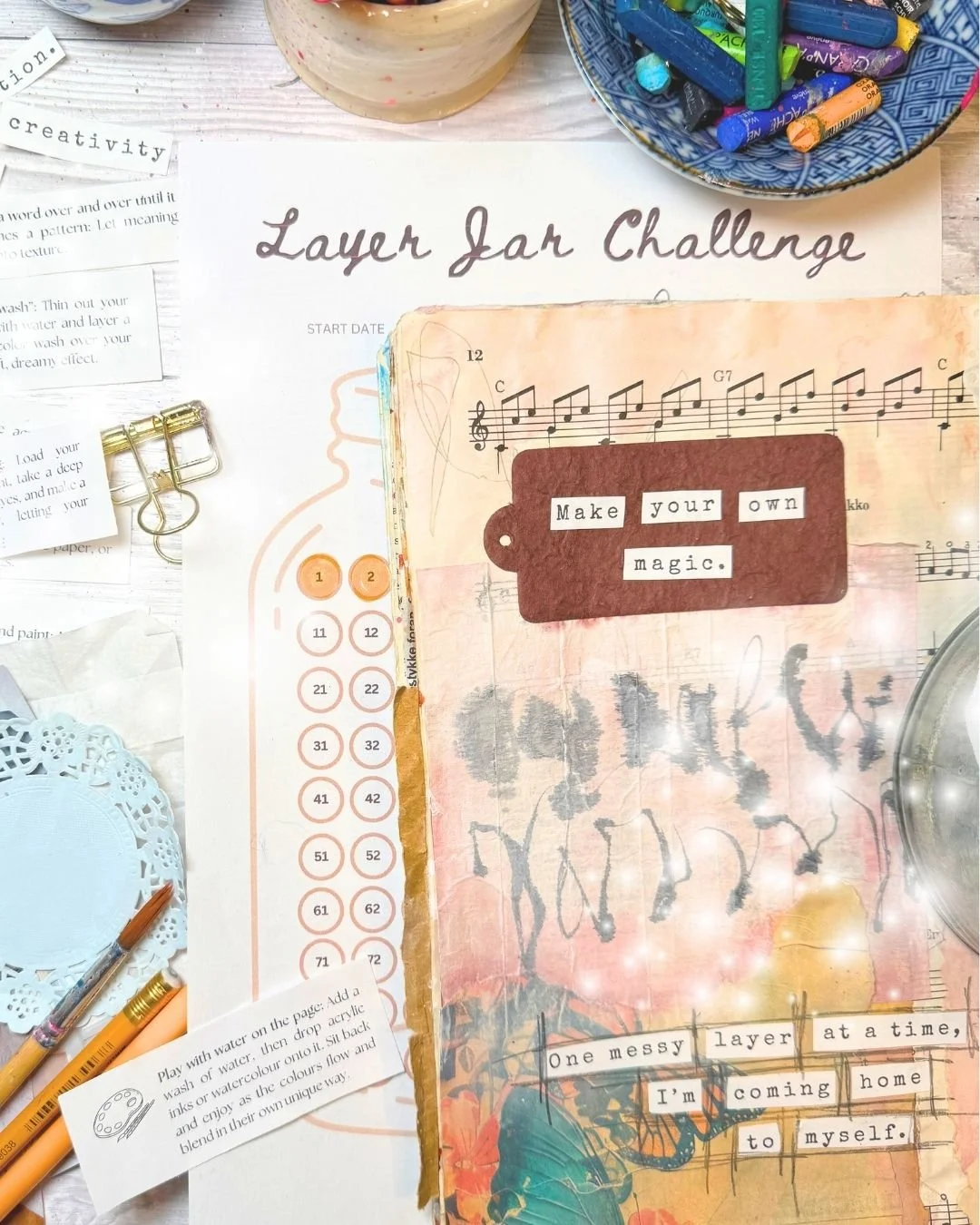 The Layer Jar has over 60 minutes of tutorials included to help you get going with your creativity. 💖 You will also get the 100 prompts printable, a Layer Jar Challenge printable, an Affirmation printable and a BONUS section about how to use this method for the 100 Day Project.